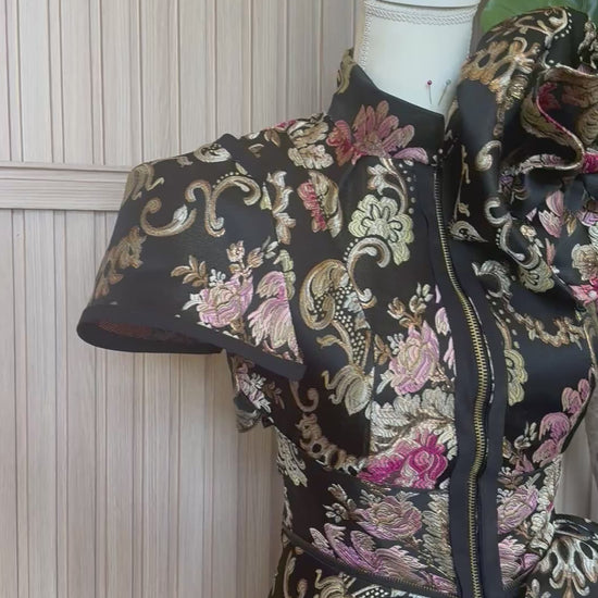 Step into elegance with The Midnight Blossom Jacket. A statement piece where timeless romance meets bold couture design. Crafted from a rich, floral jacquard fabric, this jacket embodies the beauty of blooming florals under a midnight sky, woven with intricate tones of gold, rose, and deep noir.
