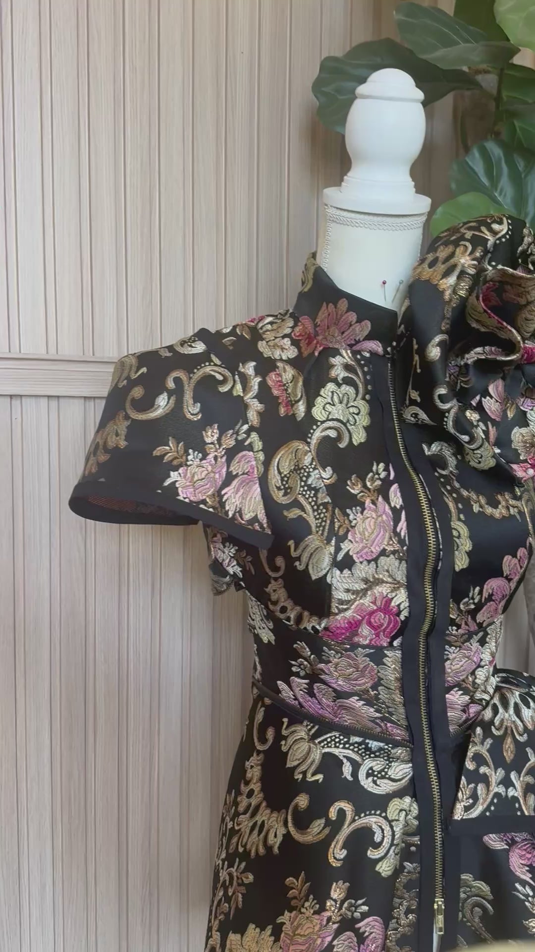 Designed with a sculptural silhouette, this piece features a dramatic oversized rosette shoulder, a structured peplum that flatters the waist, and a sleek front zipper for a modern edge. Every detail is intentionally placed to create movement, dimension, and undeniable presence.